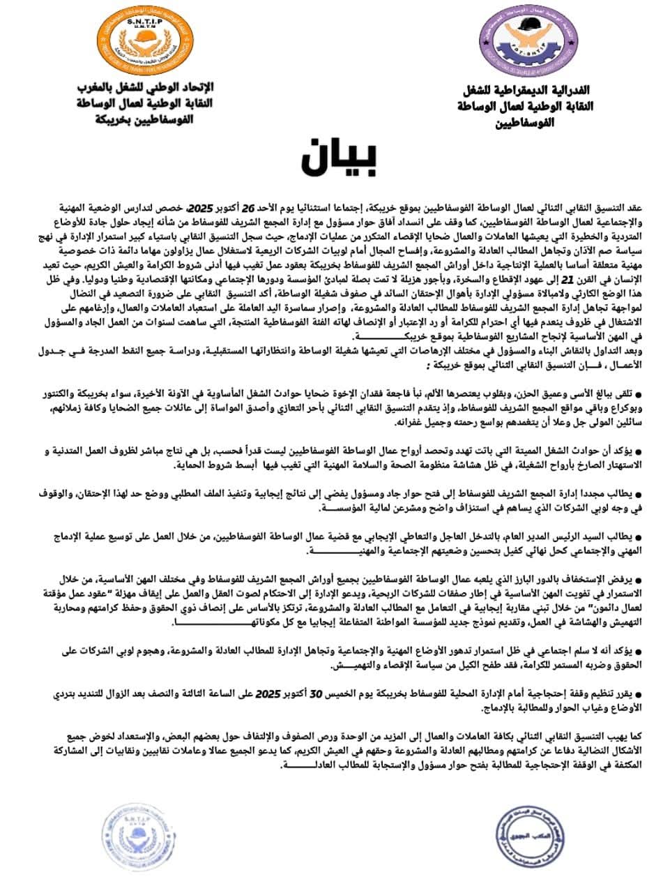 في الختام، يؤكد التنسيق أن لا سلم اجتماعي في ظل استشراء هذا التهميش والإقصاء، معلنا عن تنظيم وقفة احتجاجية تاريخية يوم الخميس 30 أكتوبر 2025 أمام الإدارة المحلية للمجمع الشريف للفوسفاط، ويدعو كافة العمال والنساء النقابيات إلى رص الصفوف والتوحد في مواجهة هذا الظلم