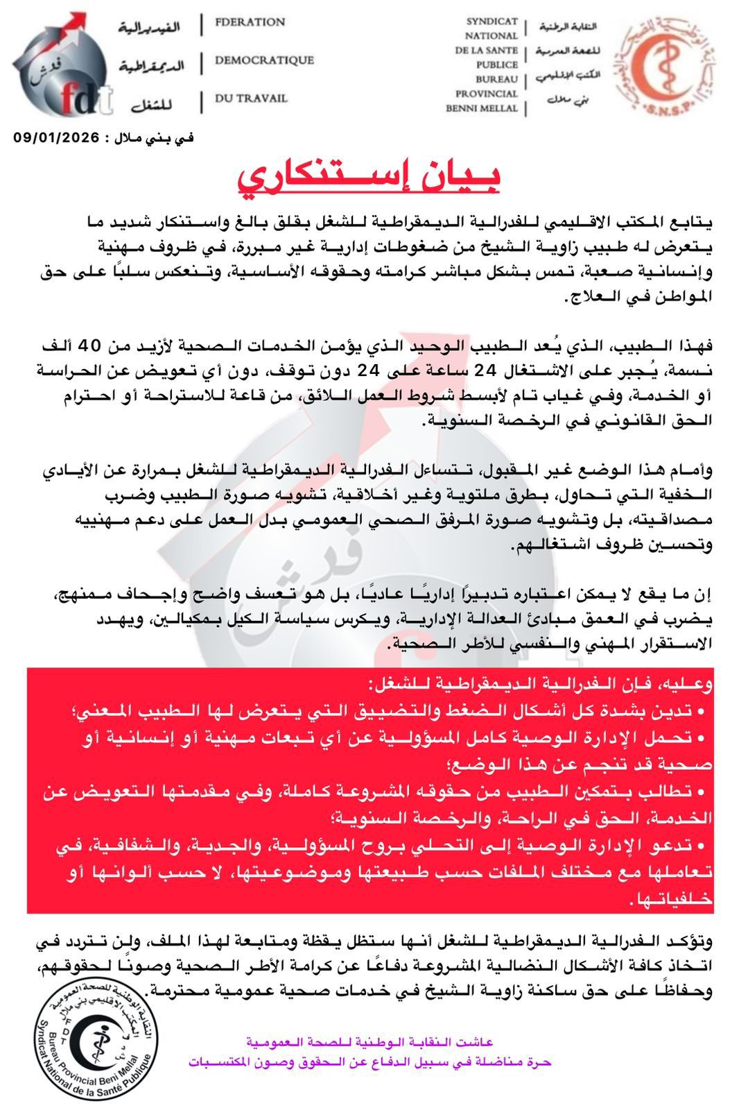 بيان الفدرالية الديمقراطية للشغل لم يأتِ من فراغ. هو صرخة إنذار قبل أن يتحول الإرهاق المهني إلى كارثة إنسانية أو صحية. تحميل الإدارة الوصية كامل المسؤولية عن أي تبعات محتملة ليس تهديدًا، بل توصيف دقيق لمنطق المحاسبة الذي يفترض أن يسود.