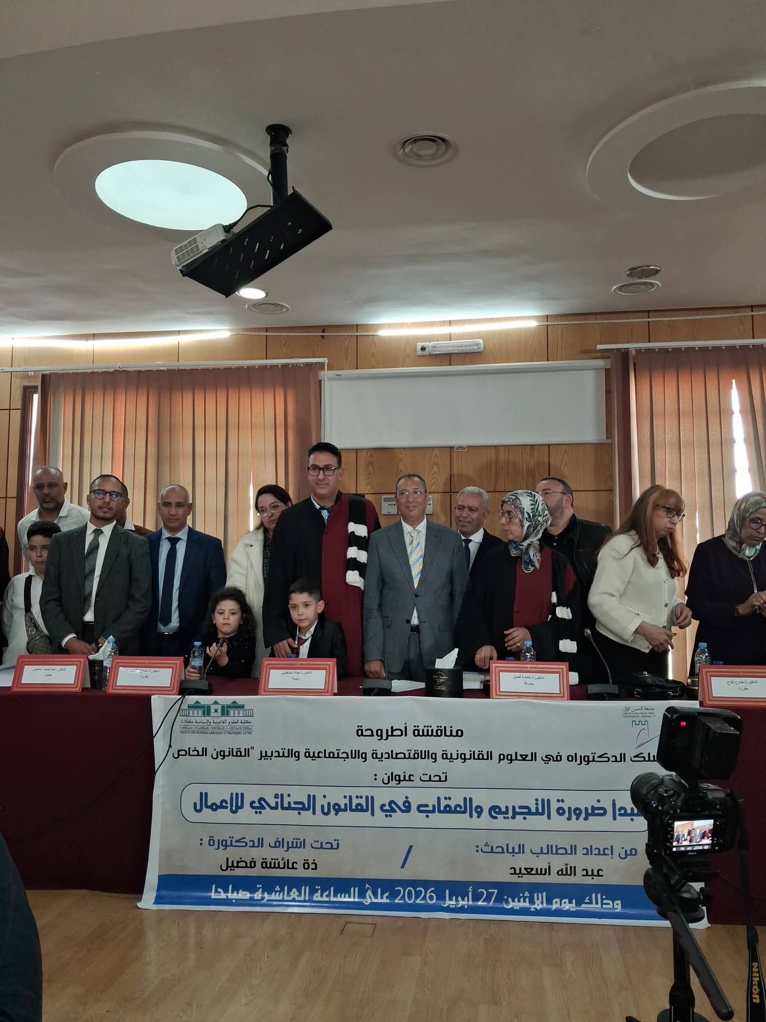 شهدت ، يوم الإثنين 27 أبريل 2026، مناقشة أطروحة دكتوراه متميزة في شعبة العلوم القانونية والاقتصادية والاجتماعية والتدبير، تخصص القانون الخاص، تقدم بها الأستاذ عبد الله اسعيد، قاضي التحقيق بـ، تحت عنوان: “مبدأ ضرورة التجريم والعقاب في القانون الجنائي للأعمال”.